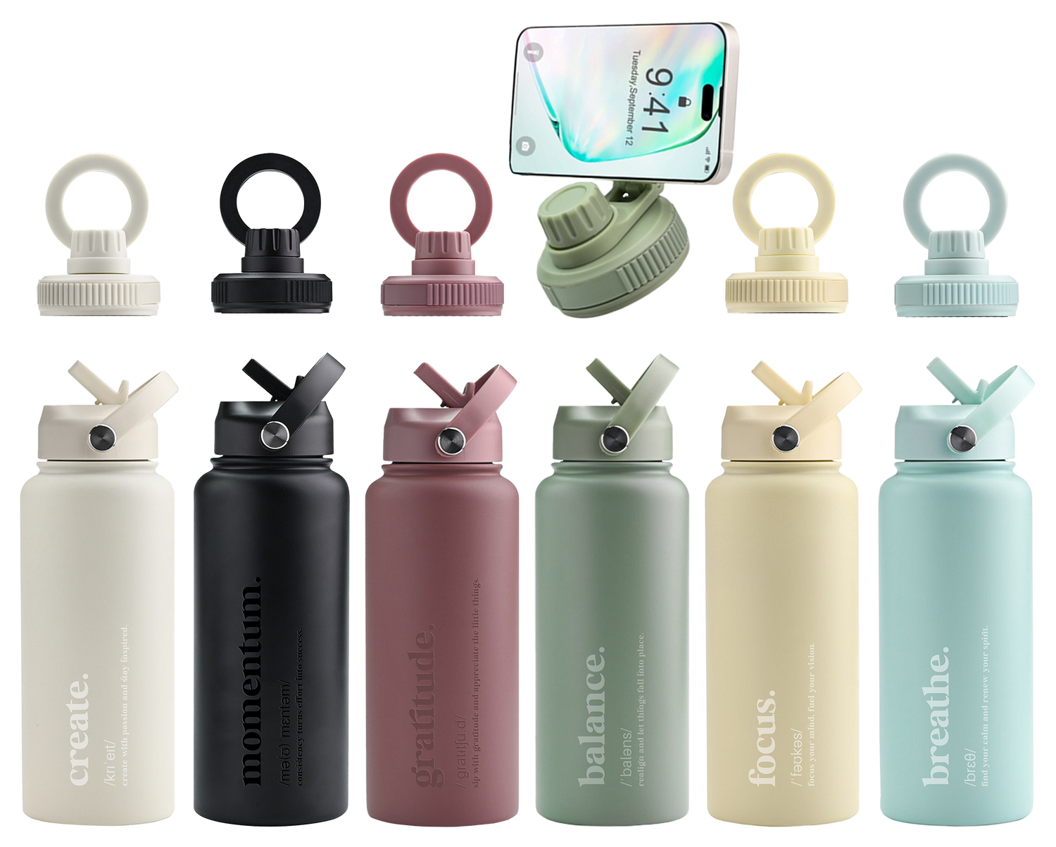 Crafting innovative insulated bottles with a magnetic phone holder lid—where sleek design meets functionality to keep you hydrated and connected on the go. Featuring an inspirational message to keep you motivated and focused, wherever life takes you.